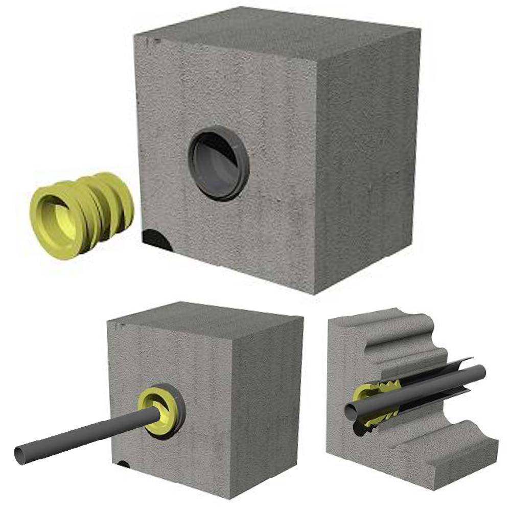 Фундамент или стена здания, наружная геометрия муфты точно повторяет, внутреннюю геометрию стандартной канализационной трубы диаметром 110 мм.